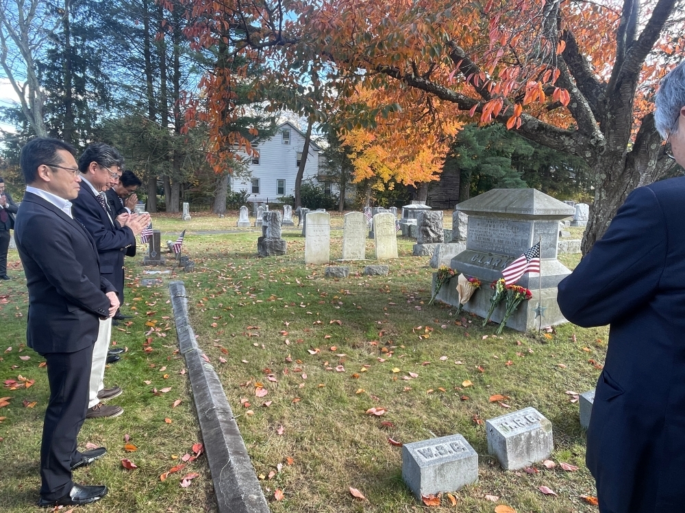 On October 23, the Hokkaido delegation, accompanied by Consul General Takahashi, visited the University of Massachusetts Amherst, where Dr. Clark once served as president, and laid flowers at his grave in tribute to his enduring legacy.